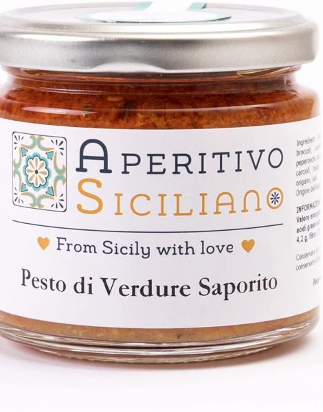 Questo pesto racchiude nell’insieme la genuinità e la freschezza dei migliori orti siculi. Sedano, rapa, peperoni, carote e cipolle, si uniscono per dar vita ad un sapore dolce con l’aggiunta di una nota gradevolmente piccante del peperoncino rosso; tutto accomunato dall’aroma di olio crudo dei più pregiati ulivi saraceni.